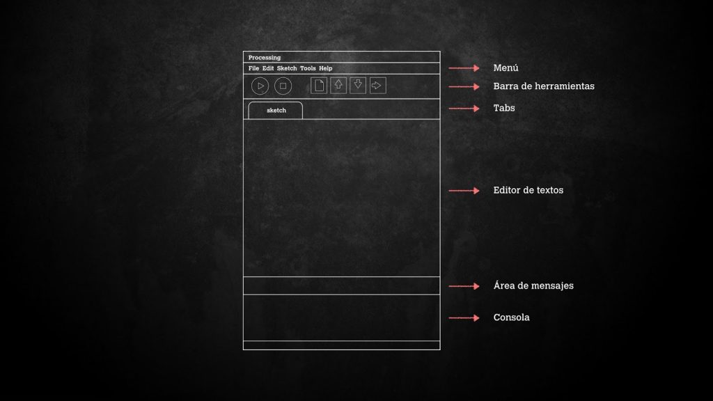 El entorno de desarrollo de Processing es un entorno simplificado y minimalista para escribir código en tu equipo, y es casi tan fácil de usar, como cualquier software de edición de texto (como TextEdit o el Bloc de notas), y se combina con un reproductor de medios. Cada Sketch (los programas de Processing se denominan “Sketch”) tiene un nombre, un lugar donde se puede escribir código, y algunos botones para guardar, abrir y ejecutar bocetos. Ver Figura 2.1.