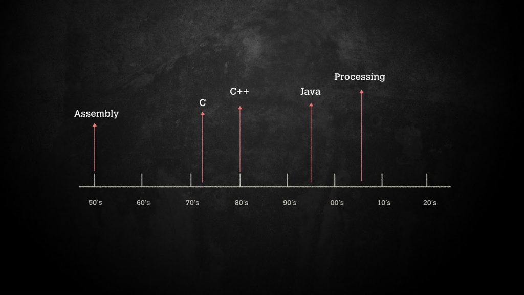 Los primeros ensambladores de lenguajes, el software que convierte el código Assembly a lenguaje de máquina, surgieron en torno a 1950. Java fue lanzado a mediados de la década de 1990. En los cuarenta años entre Assembly y Java, se desarrollaron muchos otros lenguajes de programación. Uno de los lenguajes más importantes que surgieron, que influenció fuertemente a Java y en última instancia, a Processing, era el lenguaje de programación C. Para nuestra discusión, no es necesario decir mucho más acerca de C, aparte de eso, es un nivel considerablemente más alto que Assembly, y se adoptó muy ampliamente. En comparación con Assembly, C reduce en gran medida las líneas de código necesaria para programar un ordenador. La gramática del lenguaje de programación Java, más comúnmente conocida como la sintaxis del lenguaje, se basa en gran medida en C, pero como aprenderás, Java es un lenguaje con un enfoque, incluso de más alto nivel que C.