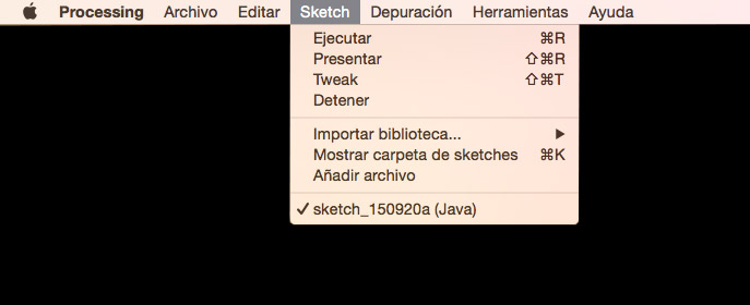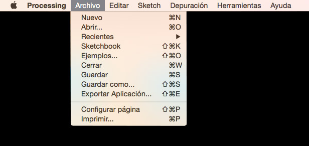 Como todas las aplicaciones, Processing tiene una serie de menús en la parte superior de vamos a ver rápidamente para no dejarnos nada en el tintero. Comenzamos con el Menú Archivo.