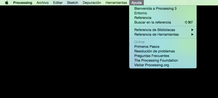 · Referencia: abre la página oficial de Processing con la referencia a las funciones. Incluye referencias al lenguaje, entorno de programación y bibliotecas.