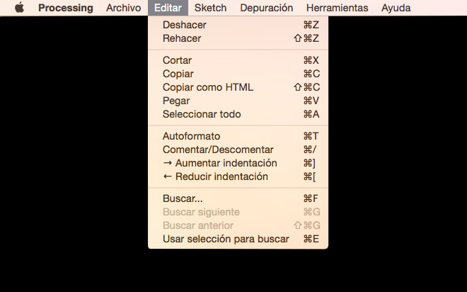 · Buscar en referencia: seleccionando un elemento en el editor de textos de processing y seleccionando Buscar en referencia abre la página de dicho elemento en tu navegador. Muy útil cuando necesitas saber qué tipo de datos o la cantidad de datos necesarios de una función en concreto.