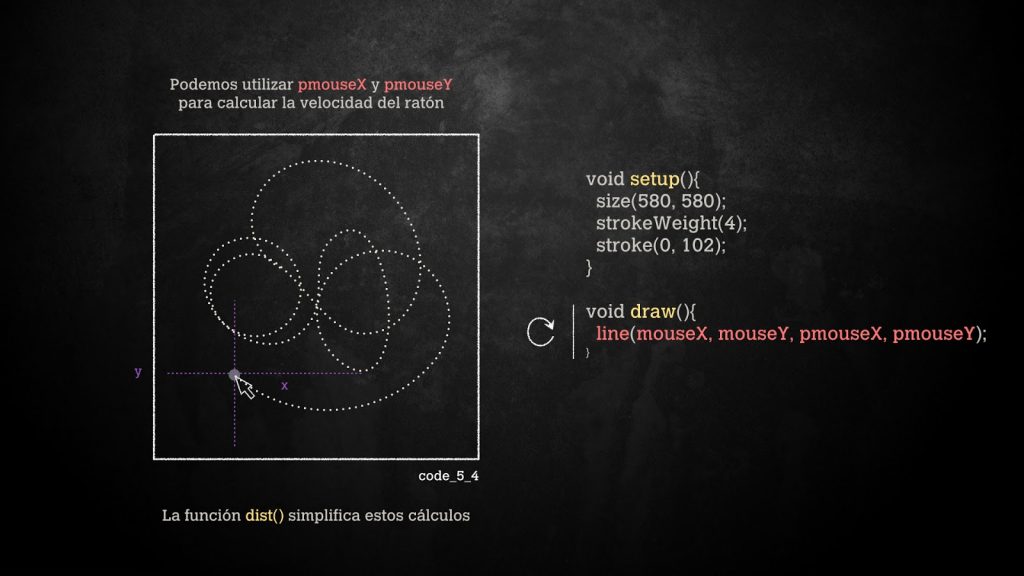 Además de mouseX y mouseY, Processing nos proporciona otras dos variables para el ratón, que son pmouseX y pmouseY, que indica la posición del ratón en el frame anterior.