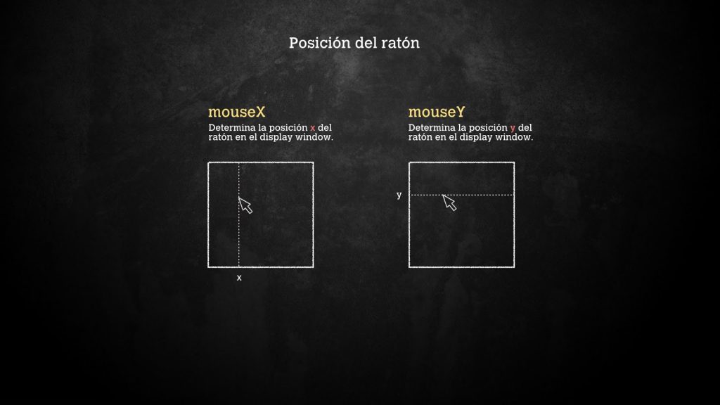 Como ya hemos comentado en el capítulo 4, Processing genera una serie de variables automáticamente cuando un programa está corriendo. Dos de estas variables son mouseX y mouseY y determinan la posición del ratón en el display window.
