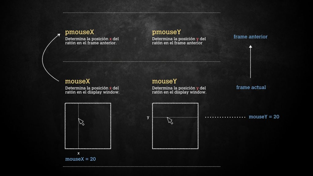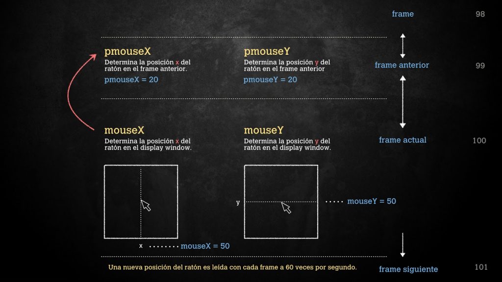 Observando la imagen superior, por ejemplo, si nos encontramos en el frame 99, vemos que el valor pmouseX y pmouseY es igual a 20, lo que significa que el ratón esta en la posición 20, 20. En el frame actual, el número 100 el ratón se encuentra en la posición 50, 50. Y cuando nos encontremos en el 101 las variables mouseX y mouseY ya serán otras nuevas y pmouseX y pmouseY tendrán un valor de 50, 50.