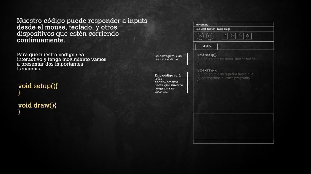 Nuestro código puede responder a inputs desde el mouse, teclado y otros dispositivos que estén corriendo continuamente. Para que nuestro código sea interactivo y tenga movimiento vamos a presentar dos importantes funciones.