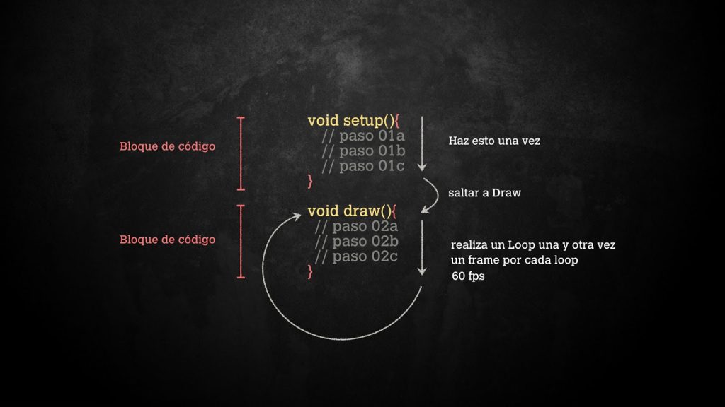 void draw() es leído continuamente, a 60 frames por segundos, si no le decimos lo contrario a Processing y nuestro equipo tiene la suficiente potencia. Aquí es donde processing crea las animaciones y la interacción. Todo lo que metamos entre los dos corchetes ({}) de void draw() será leído repetidamente hasta que detengamos nuestro programa.